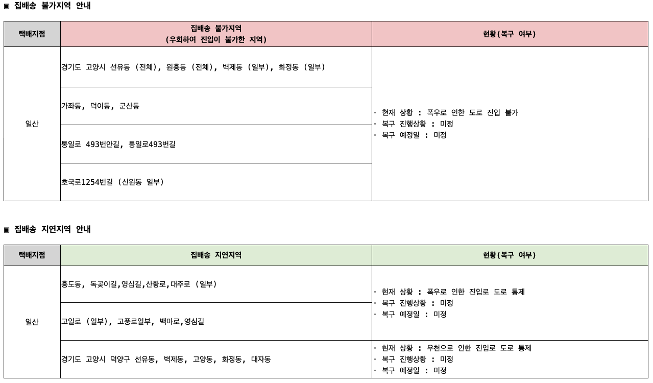 공지 [공지] 기상 악화로 인한 배송 지연/불가 지역 안내_2025.08.13
